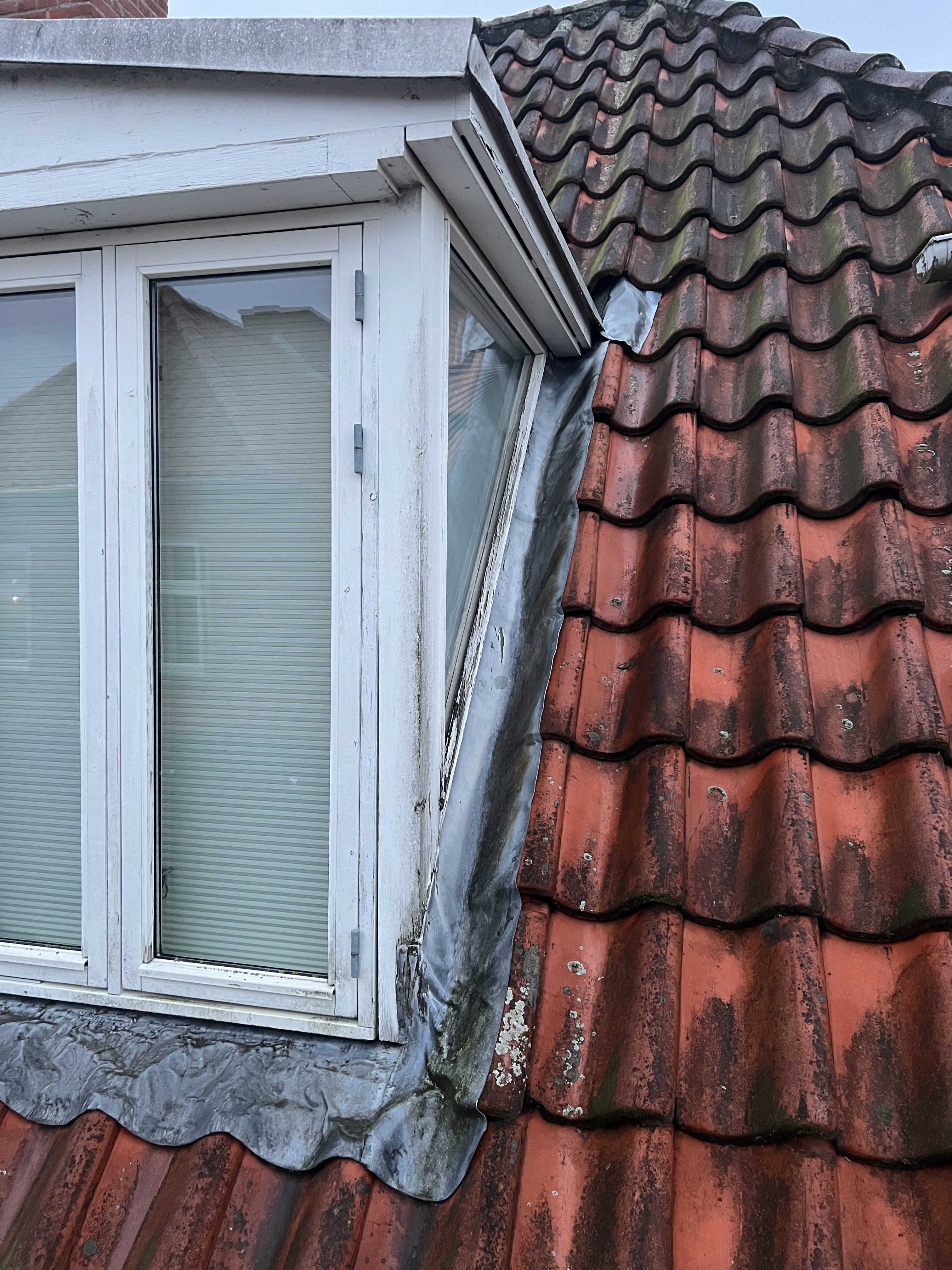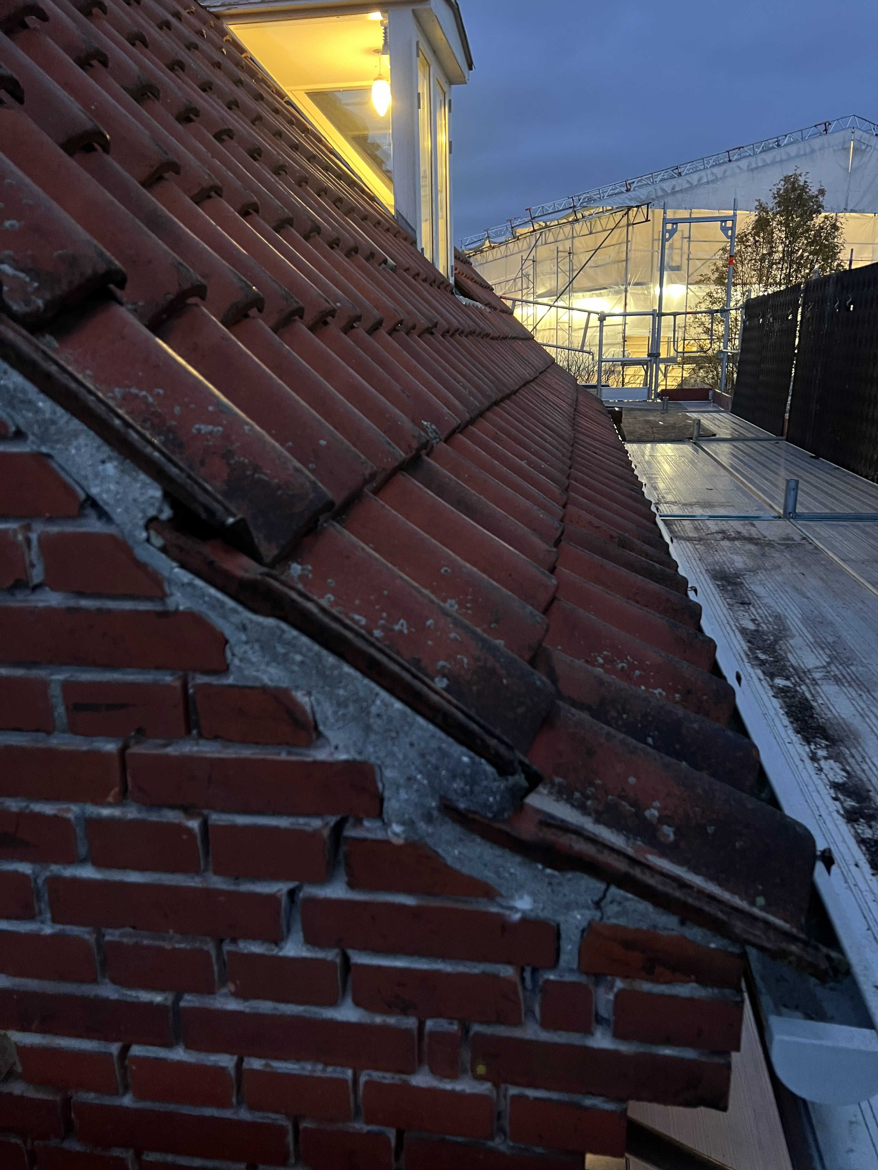 Her ses før / efter billeder af tegltaget ved gavlen.